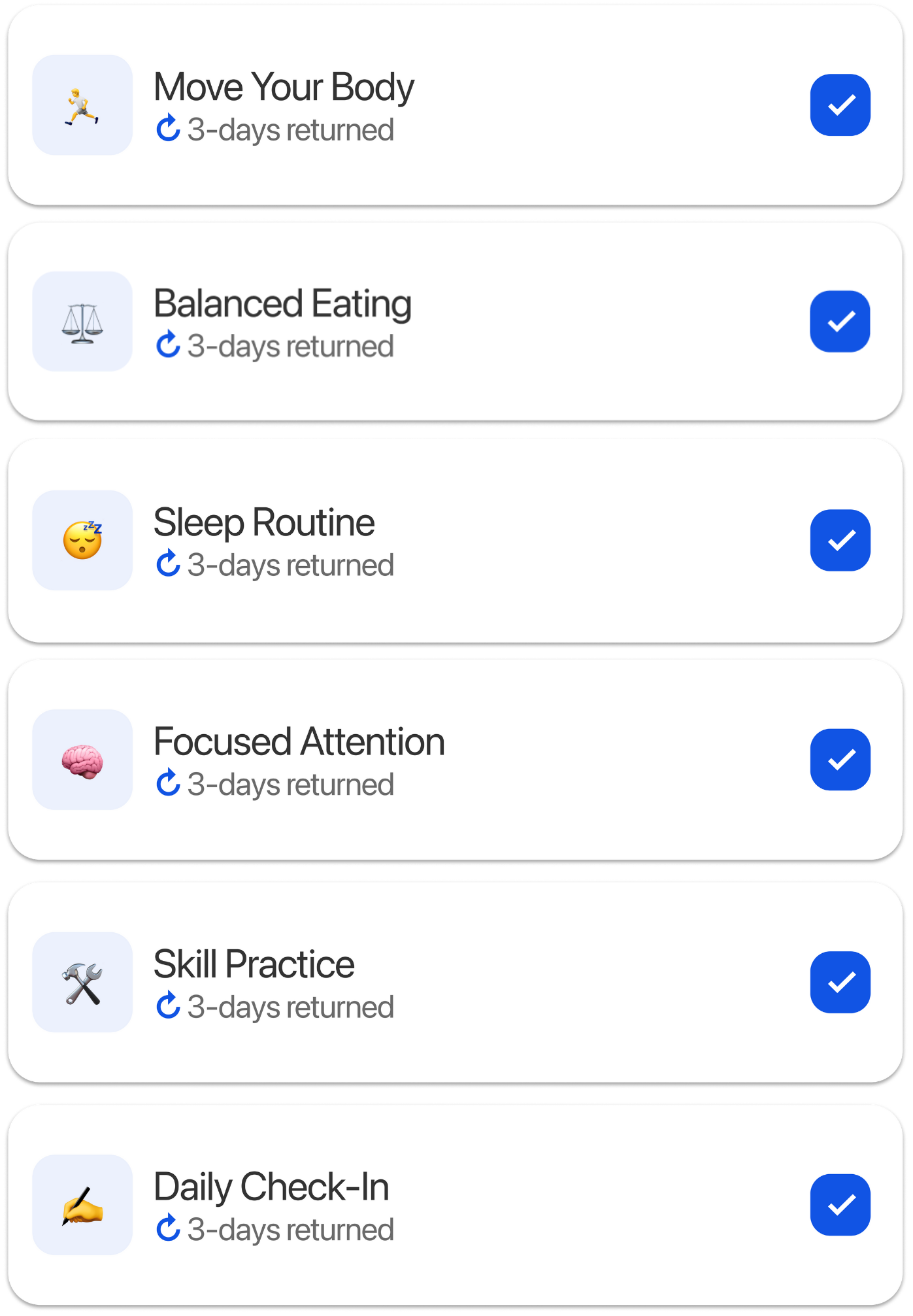 Most apps rely on anxiety-inducing streaks, but Blueprint30 is different. We focus on 'days returned' rather than perfect streaks, ensuring you level up your life without the pressure of perfection. Because progress isn't linear, missing days does not reset your progress; the system is designed to support you, not overwhelm you.